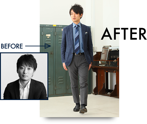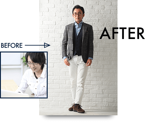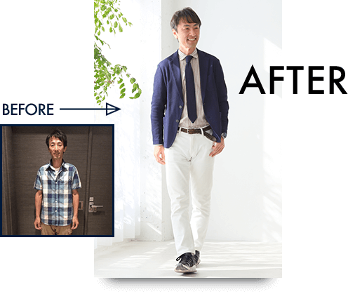 サービスを受ける前は、何を着てもパッとしなかったのが悩みでした。恥ずかしいけど、妻にスーツを買ってきてもらったり、一応最低限のブランドは着てるけど、それだけじゃ上手くいかない。法則性とか、コーディネートのことはわからないし、教えてくれる人もいないし。あとはファッション雑誌を見てもわからない。
